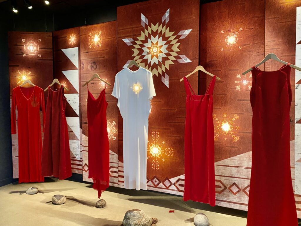 One of my first stops was the Canadian Museum for Human Rights, where I viewed Only in Darkness Can We See the Stars, an installation by Jaime Black-Morsette and KC Adams. At the centre of the piece is the white dress of Sky Woman, surrounded by empty red dresses. Some of the dresses bore clay handprints—haunting, and grounding, connecting back to the land.