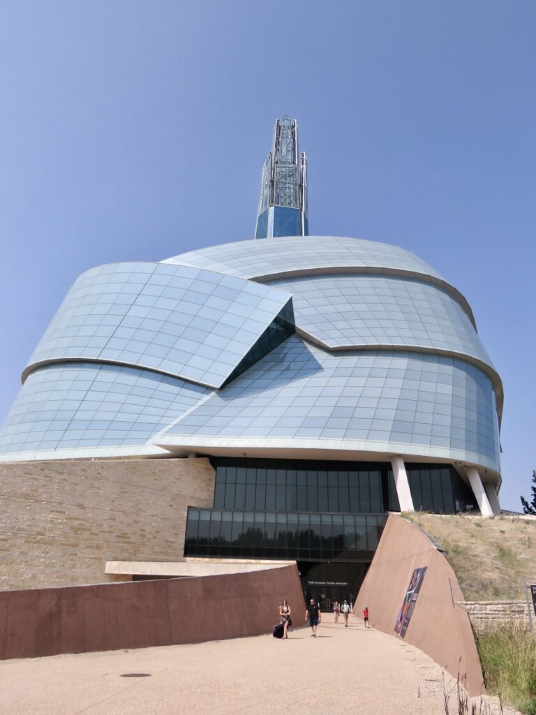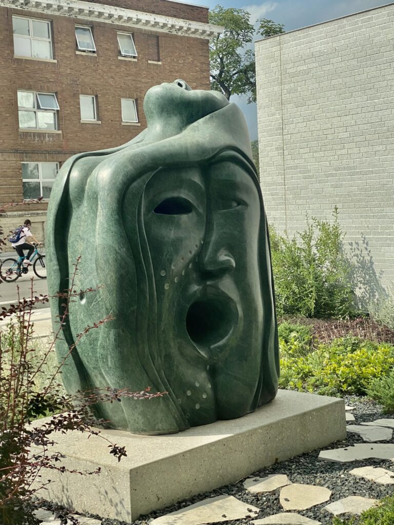 Back in the city, the Winnipeg Art Gallery-Qaumajuq pulled me in with its incredible collection of Inuit art. I was able to touch screens that let me search by artist and region. The story of Sedna, the sea goddess with a whale’s tail who is sometimes kind, sometimes cruel, was an ongoing theme in the soapstone sculptures. Outside, I found myself captivated by Tuniigusiia/ The Gift by Goota Ashoona, a single-stone sculpture made of Verde Guatemala marble. It depicted a grandmother teaching her granddaughter to throat sing. As powerful as it was tender. The artwork was commissioned by the Manitoba Teachers’ Society “to honour teachers all around us—in the land and in our lives—who reveal the truth, wisdom and beauty that connect us all.”